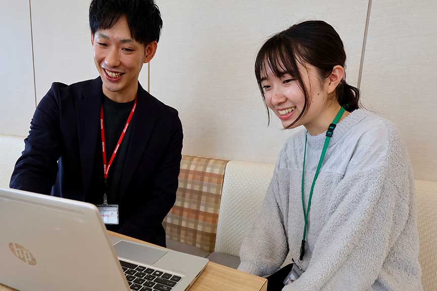 私がドコモ・サポートを志望した理由は、お客さまに寄り添ってサービスをわかりやすく改善できる仕事がしたかったからです。ドコモ・サポートはお客さまの声が直接入ってくるコールセンターの事業と、サービス改善に携われるビジネスサポートの2つの事業があります。加えて、就職活動をしていた当時、ドコモ・サポートの説明会で「人に優しく」「ドコモの五感」というキーワードがあり、お客さま目線でのサービス改善がドコモ・サポートならできると思い志望しました。